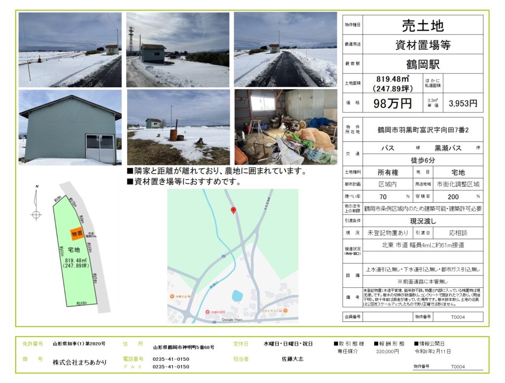 | 特記事項 | 隣家と距離が離れており、農地に囲まれています。資材置き場等におすすめです。 未登記物置あり(木造平家建・築年数不詳)物置と内部に入っている残置物は現況渡しです。 樹木の切株が数個あり。 コンクリートで囲まれたマスあり。(用途不明)。 数十年前は豚舎が建っていた場所です。 樹木が数本植えられています。 道路との高低差がおおよそ1mくらいあります。 前面道路に上水道、下水道、都市ガスの配管はありません。 鶴岡市条例区域内のため建物の建築可能。 建物を建築の際は建築許可が必要です。 |