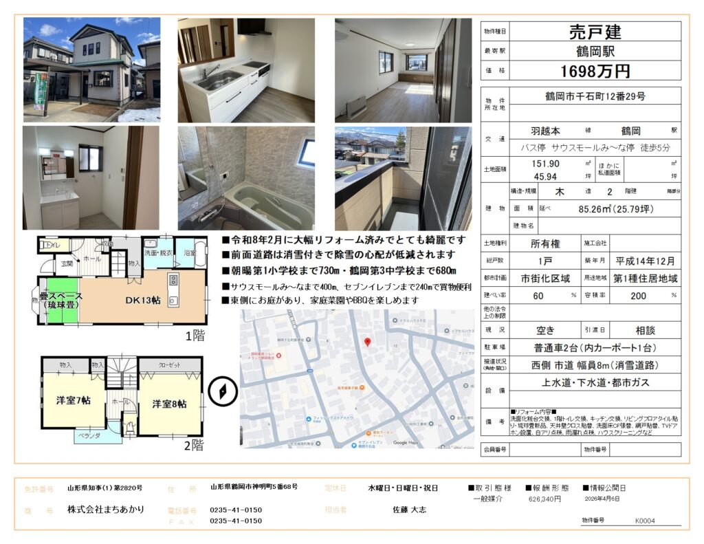 ★商談中★鶴岡市千石町リフォーム済み中古一戸建て2LDK【1698万円】