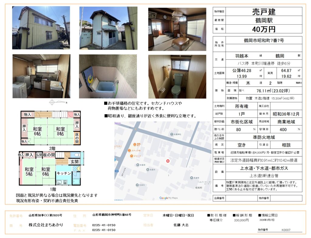 ★商談中★鶴岡市昭和町中古住宅【4K】【40万円】up